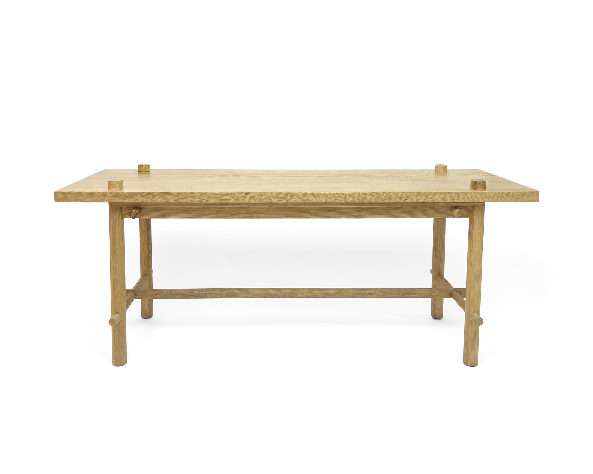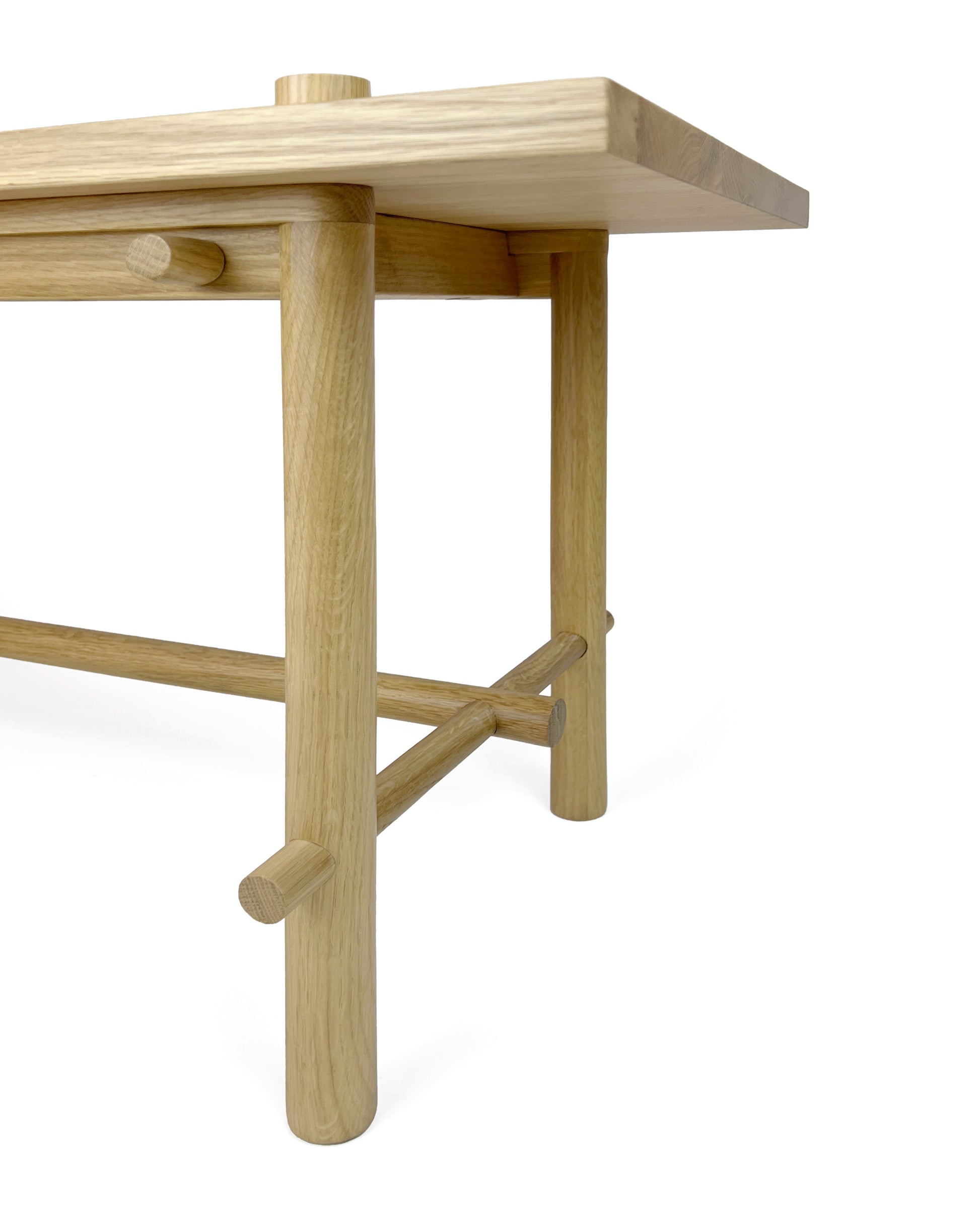 Legs and frame are crafted from solid white oak. Bench seat panel is constructed with solid oak edge banding and extra thick veneer over a plywood core for strength and durability.